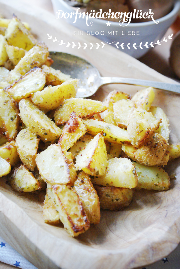 Weil es zum Mittag immer etwas schneller gehen sollte (ich bin kein Fan vom stundenlang in der Küche Essen vorbereiten Typ), habe ich uns Kartoffelis gewaschen, in Viertel geschnitten und sie in eine große Schüssel gegeben.